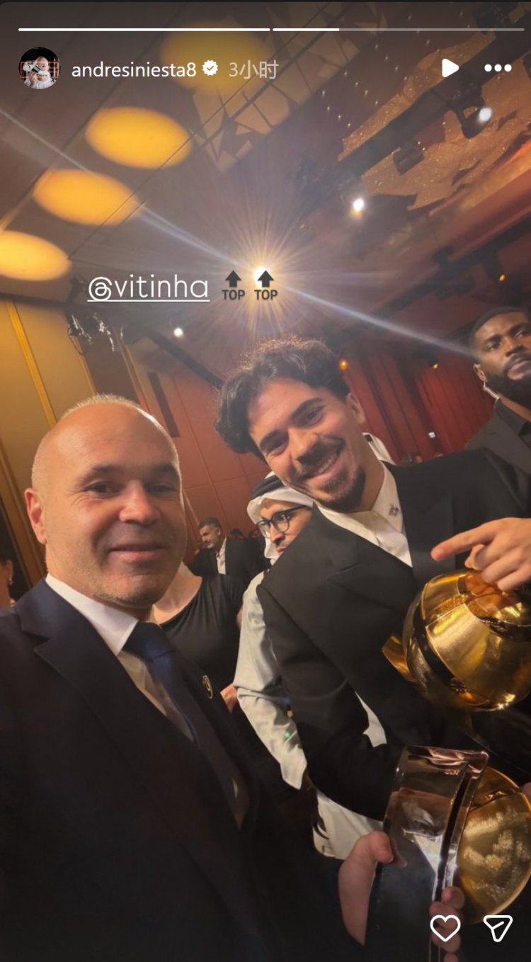 伊涅斯塔出席环足奖颁奖典礼,并获得生涯贡献奖,他在社交媒体上晒出与德约科维奇、维蒂尼亚的合照。